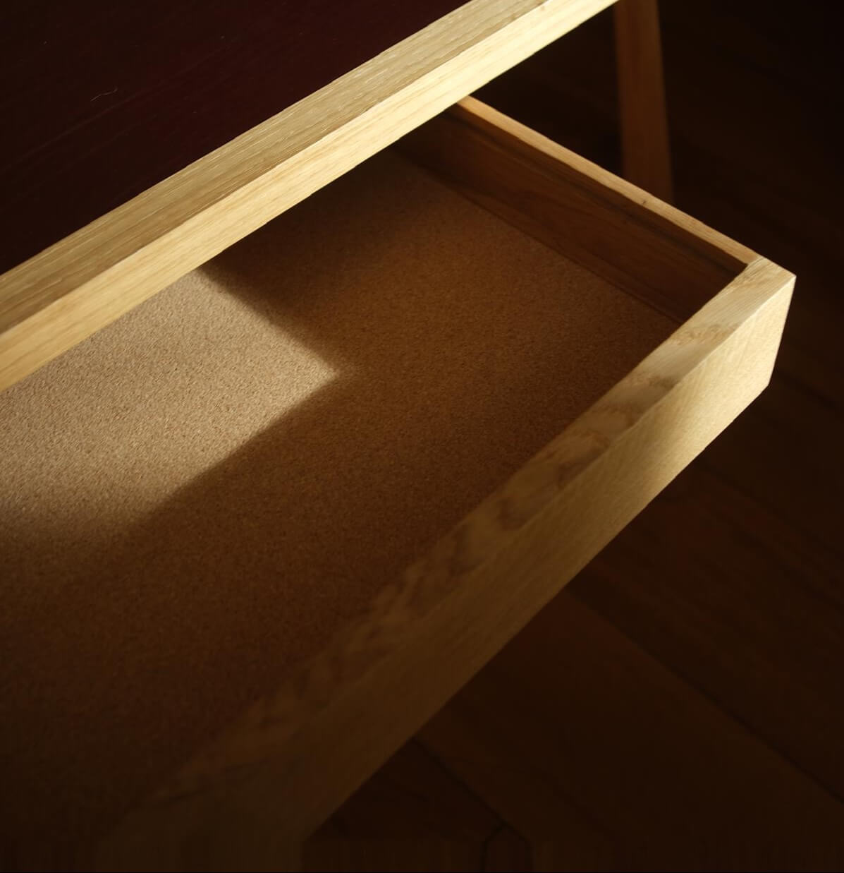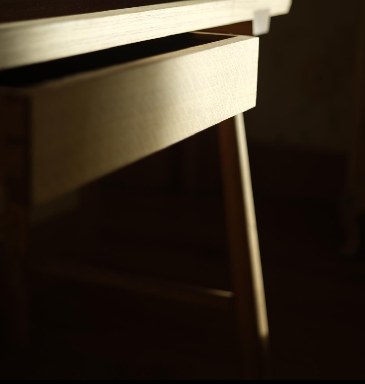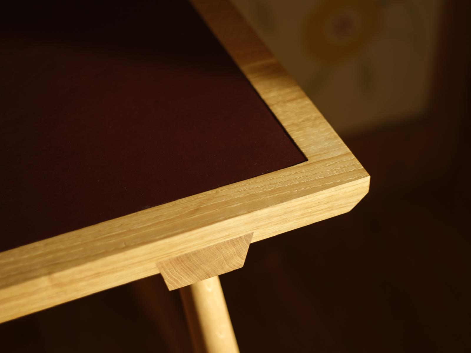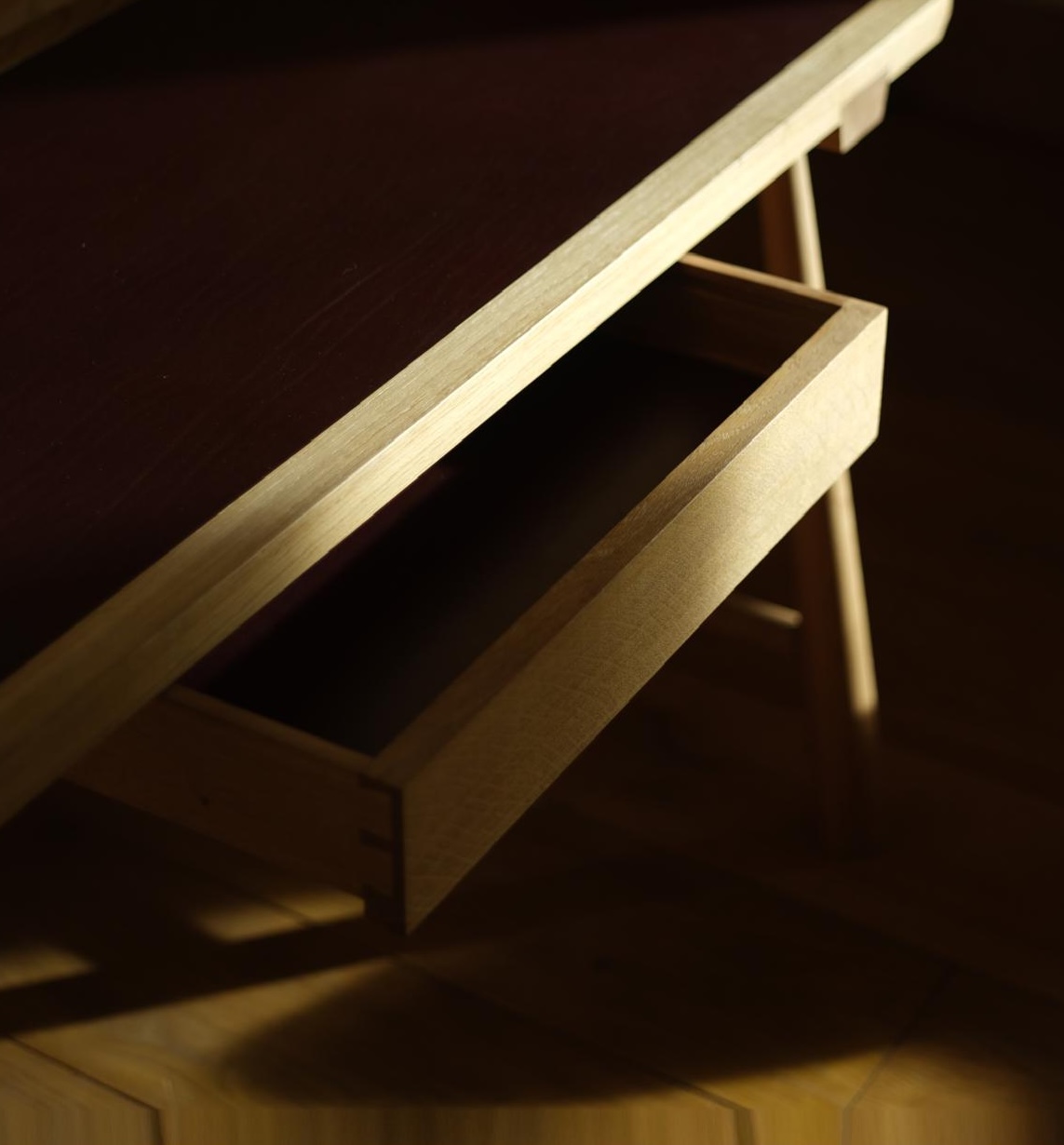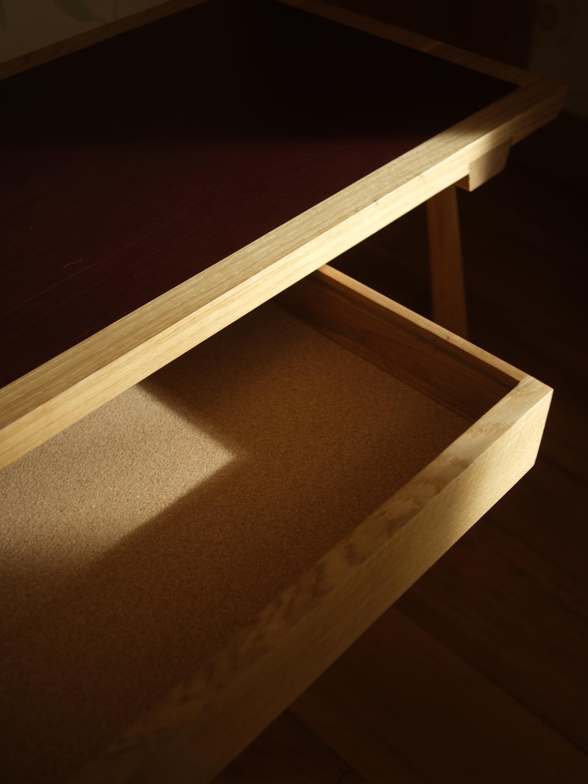 Handcrafted from solid British oak, this writing desk balances function and refinement. The top features a vegetable-tanned leather inlay, offering a soft, tactile surface that will age beautifully over time. Lightly tapered legs and a central drawer keep the form clean and purposeful. Made in our own workshop, it’s a timeless piece — simple, elegant, and designed for quiet focus