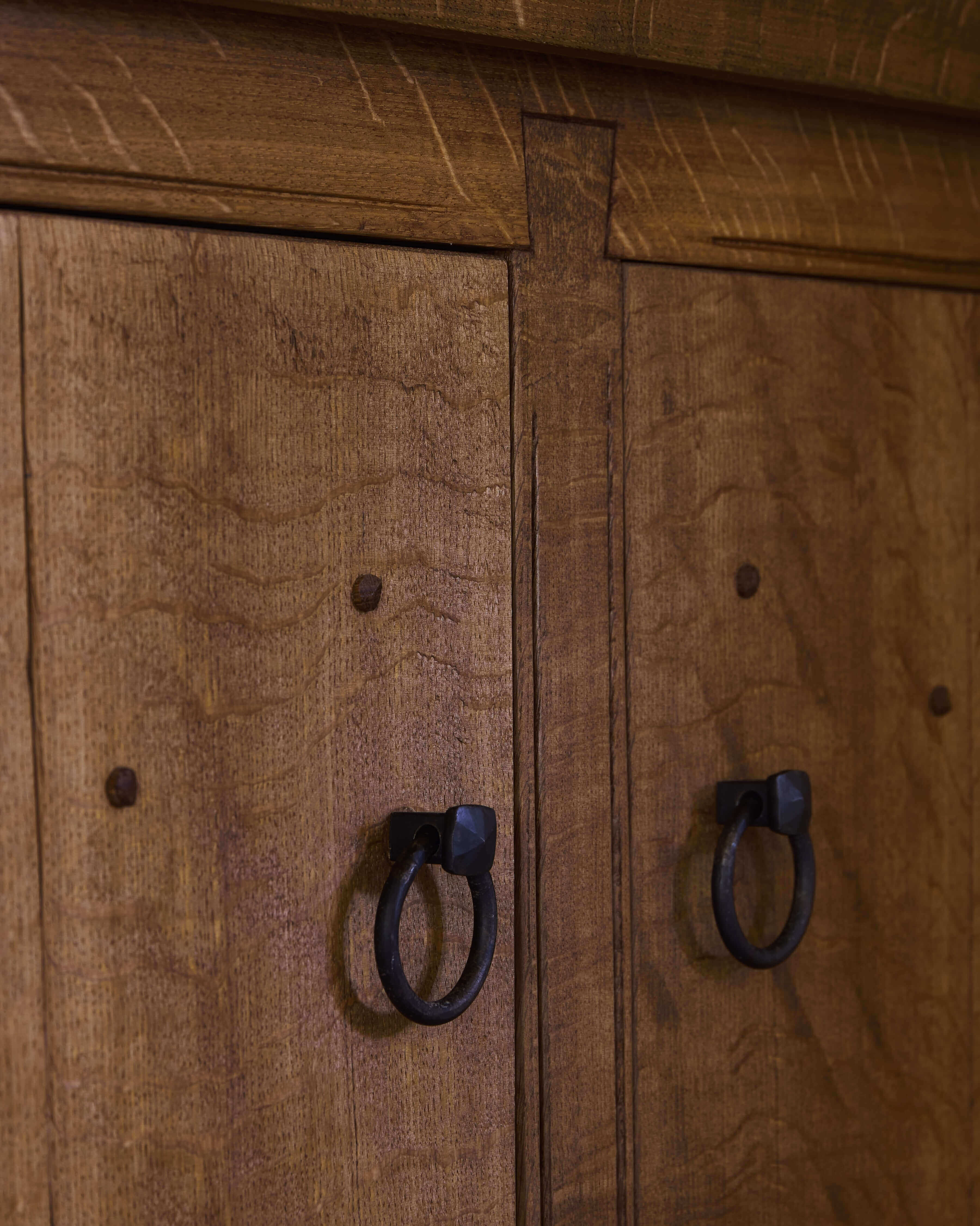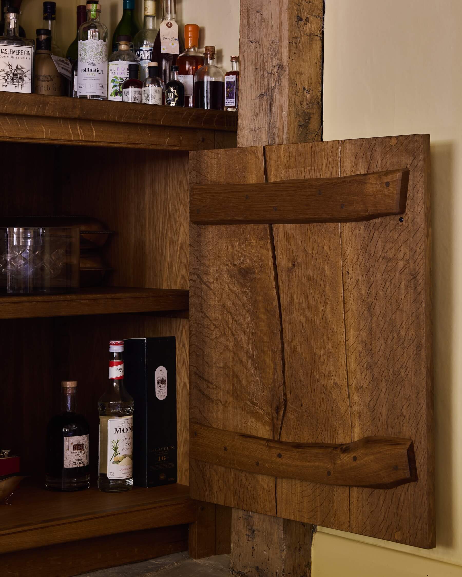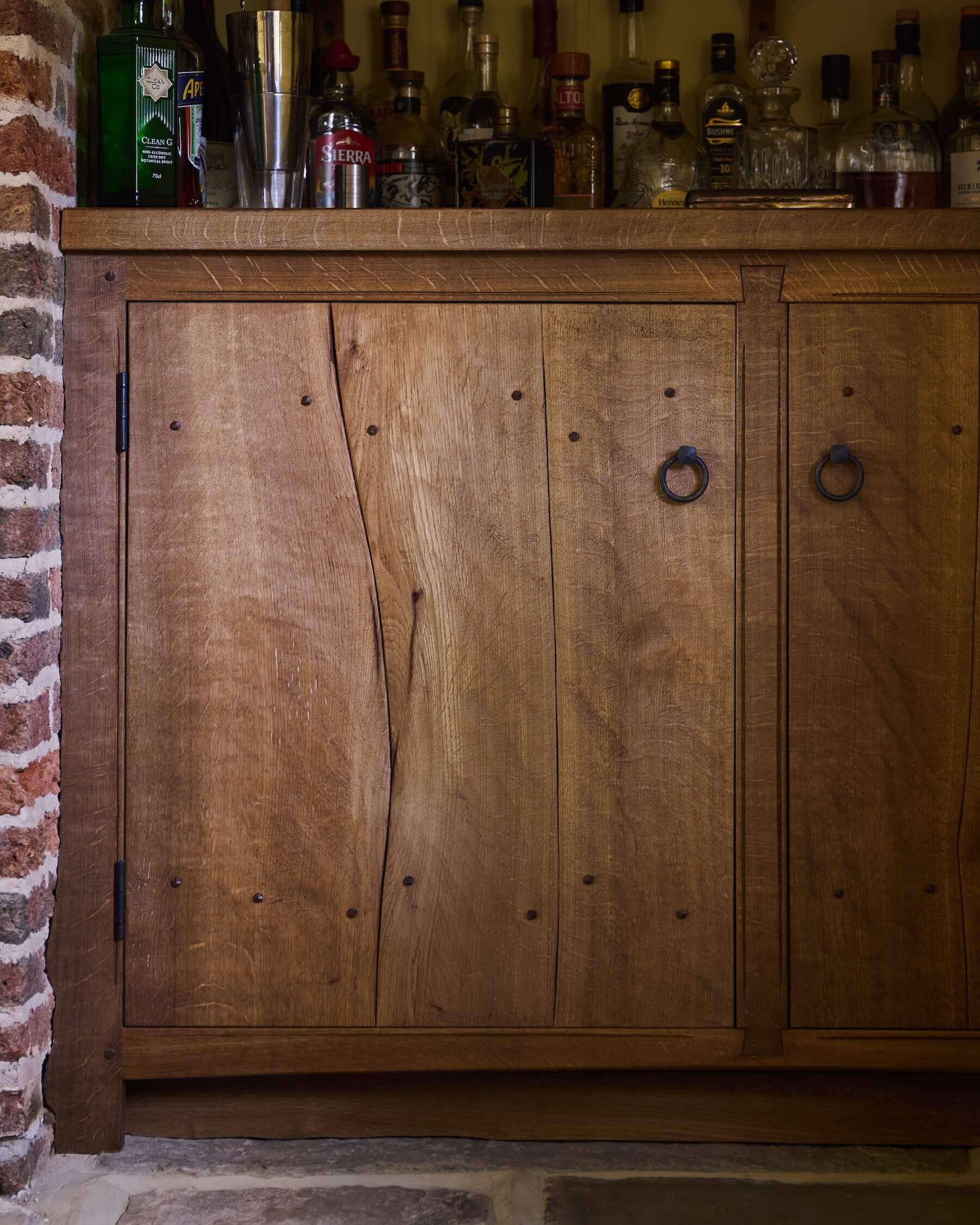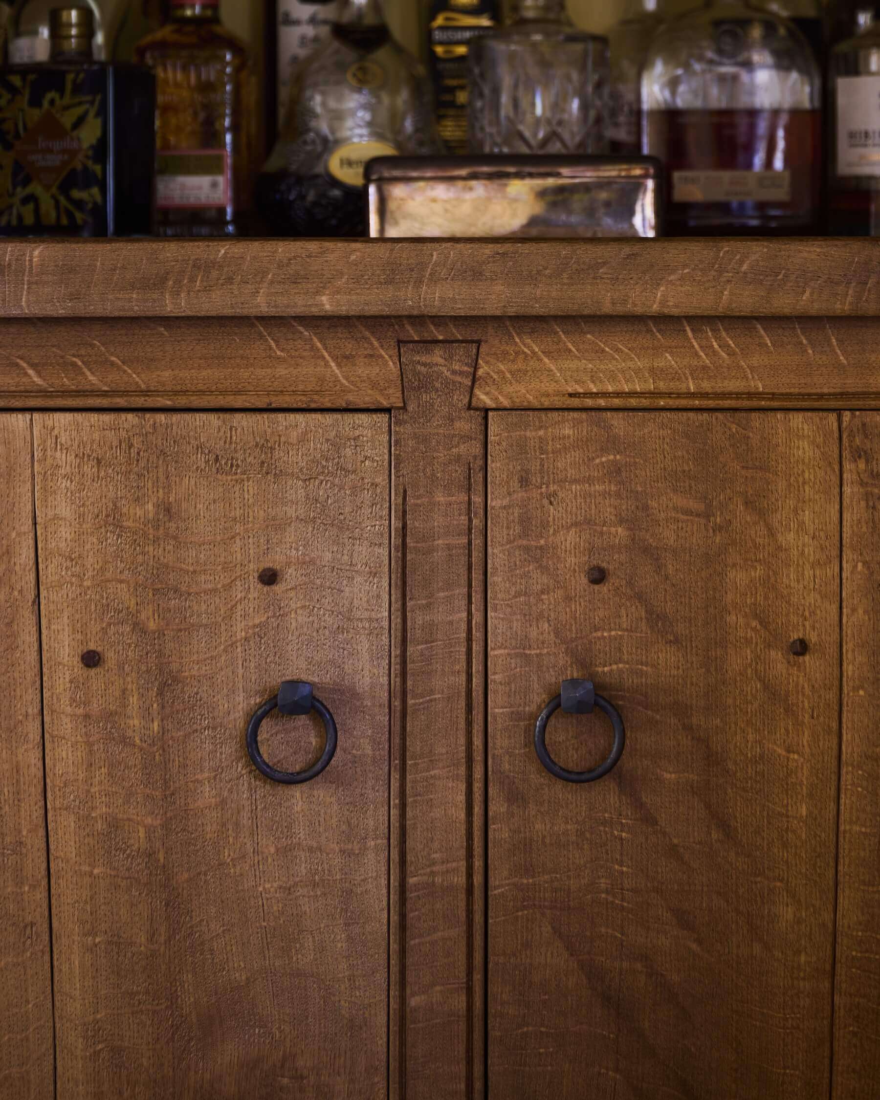 Handcrafted from quarter-sawn English oak, this bespoke drinks cabinet sits quietly within the fabric of the room — designed to complement the historic timber and brickwork that surround it. Traditional joinery, including through dovetails and wedged tenons, ensures lasting strength and integrity, while forged iron ring pulls add a tactile, understated detail.