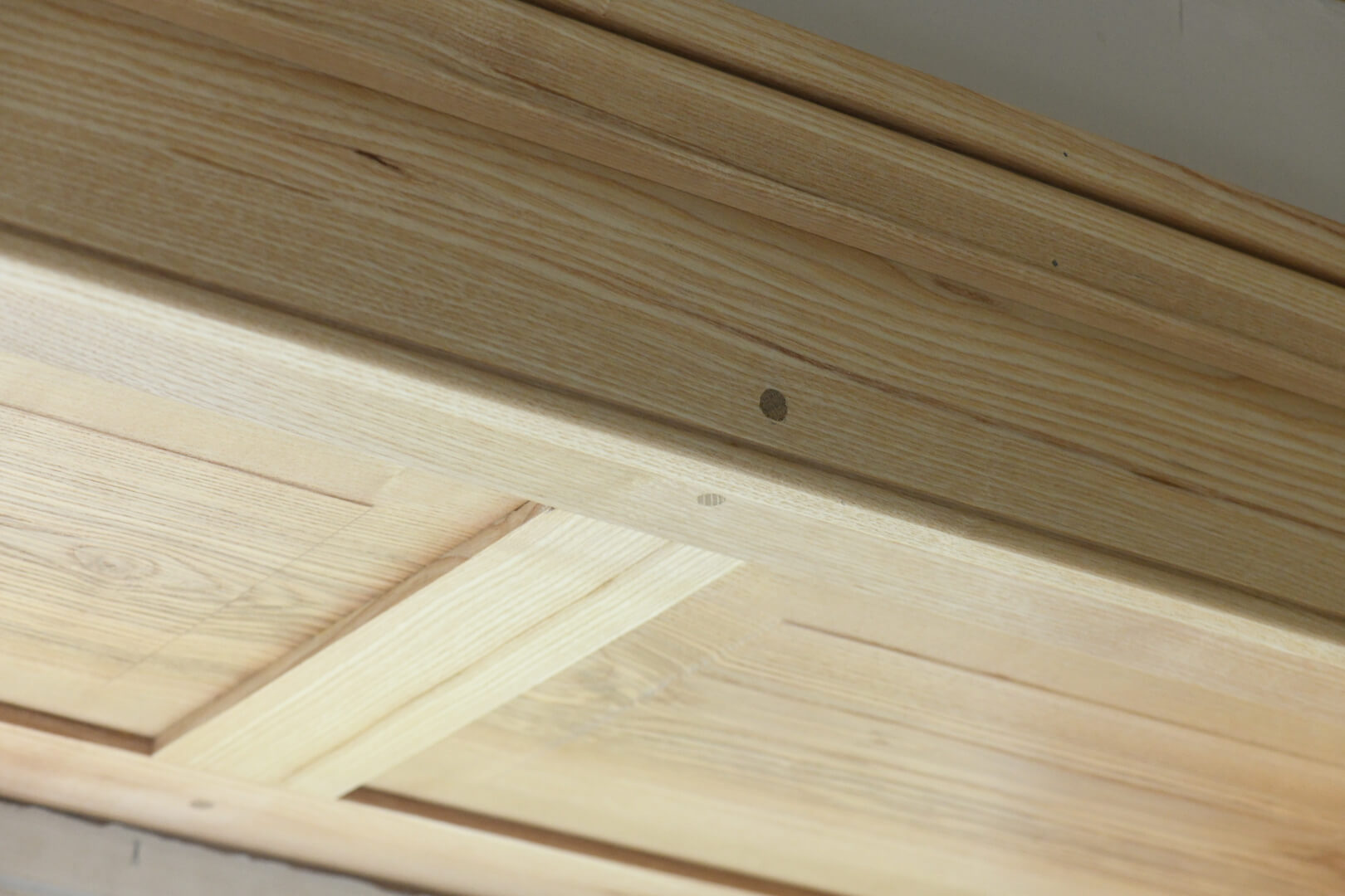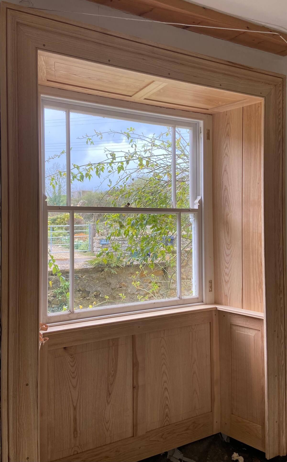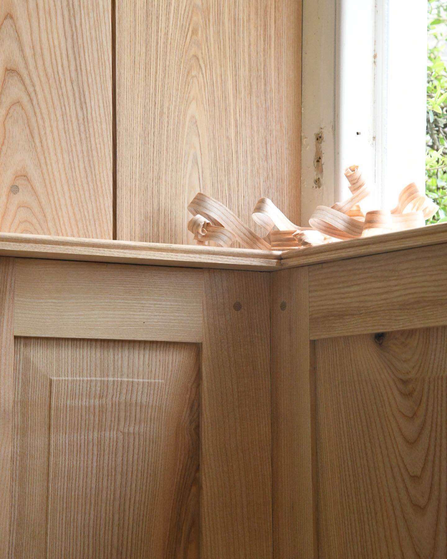 Made from solid olive ash, these bespoke shutters and wall panels bring warmth, texture, and continuity to the space. The timber’s distinctive grain flows seamlessly across the joinery, softening the architectural lines with natural variation and depth. Each element — from the framed panels to the precisely fitted shutters — is carefully made and finished in our workshop. A calm, timeless addition that balances craftsmanship with quiet presence.