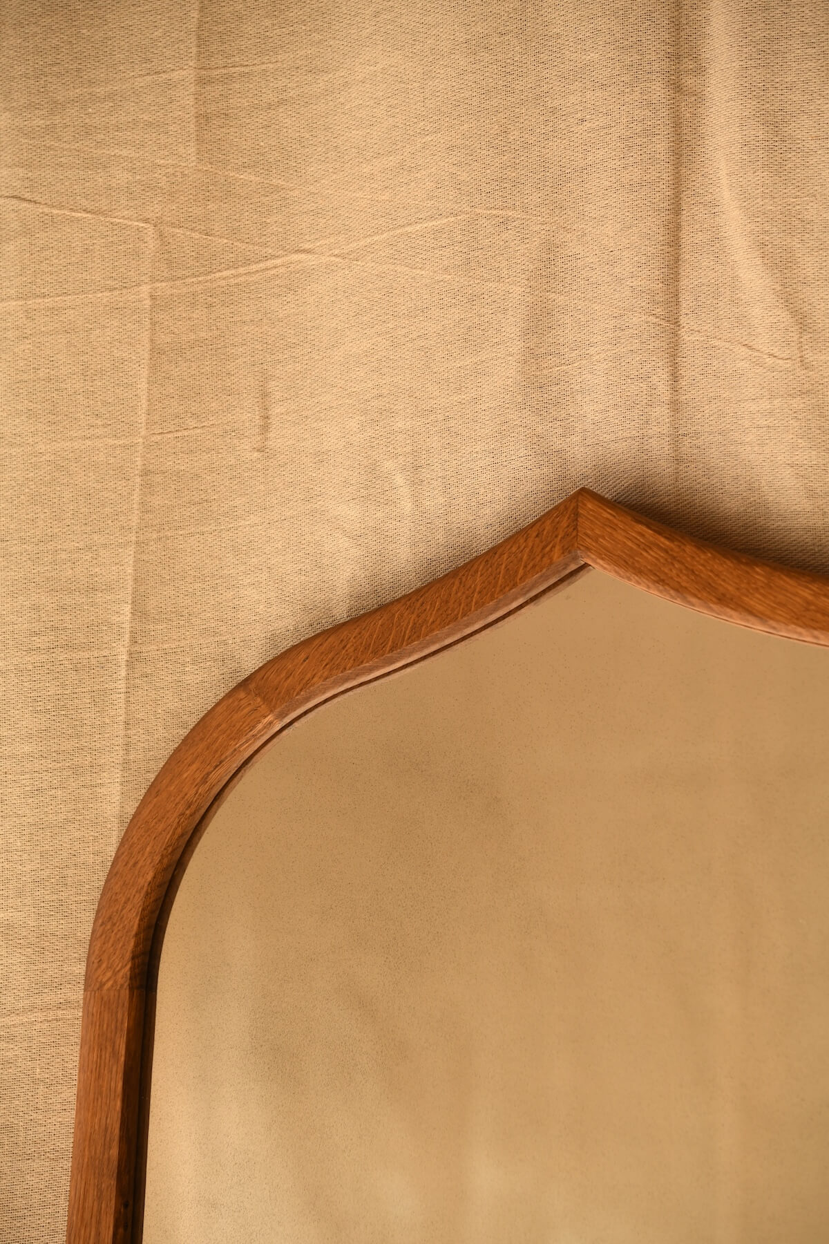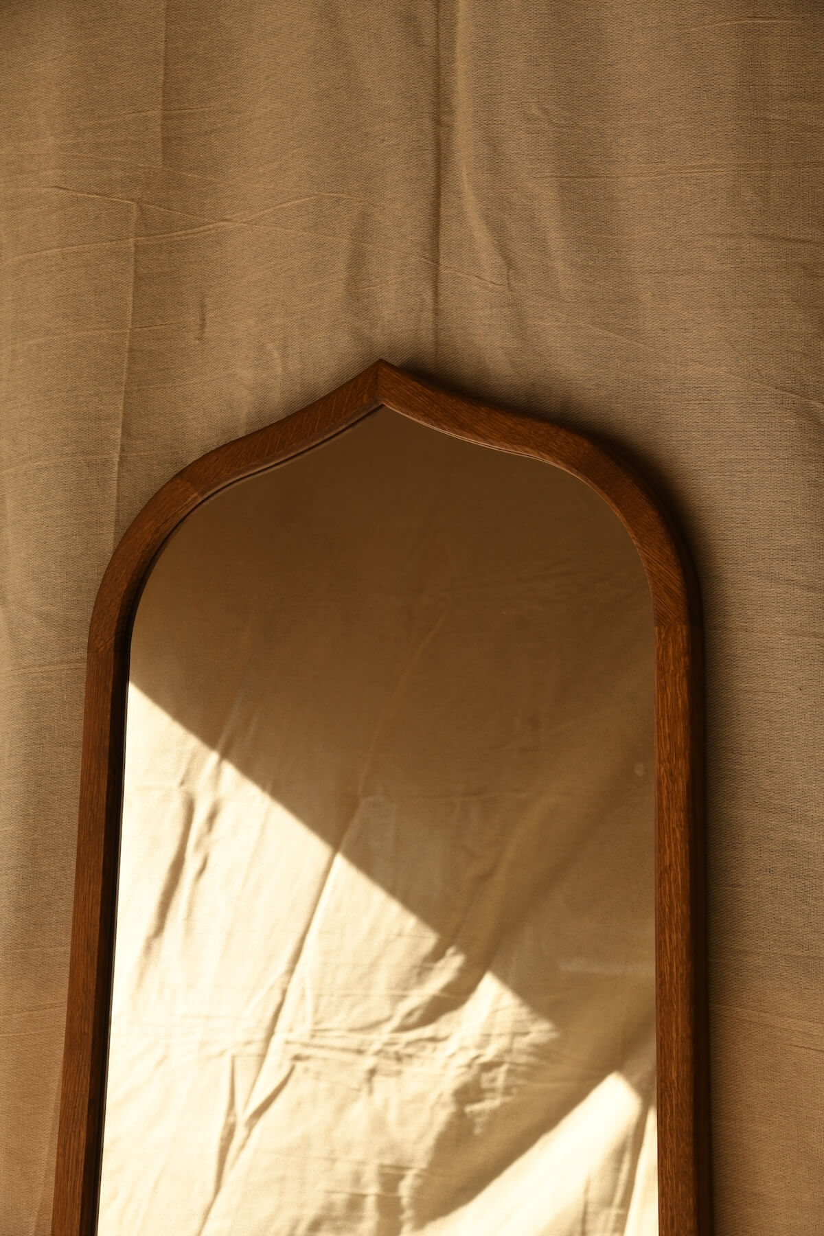 Elegant hardwood mirror inspired by the refined arches of Solanki architecture and hand antiqued Mirror Glass.