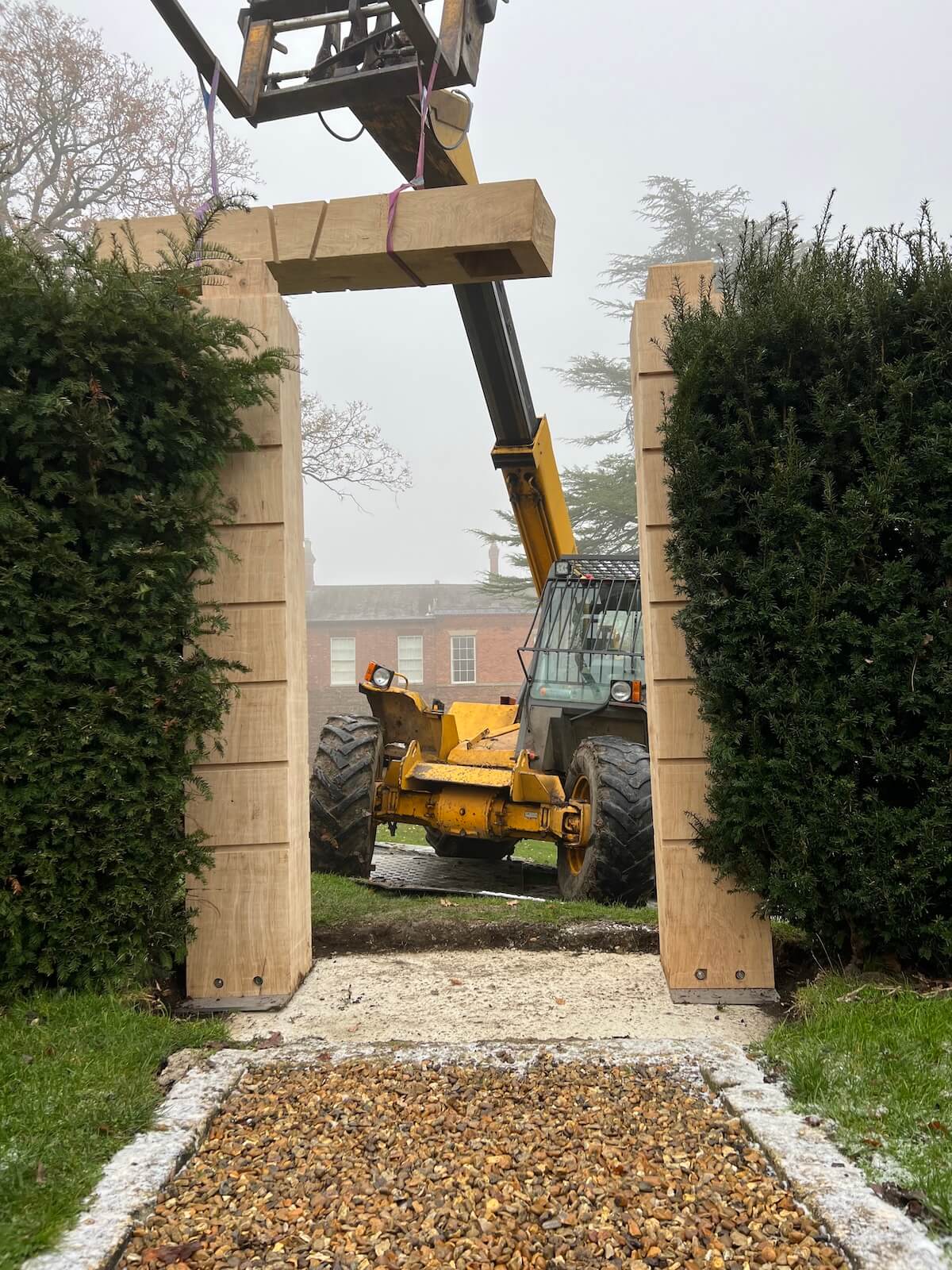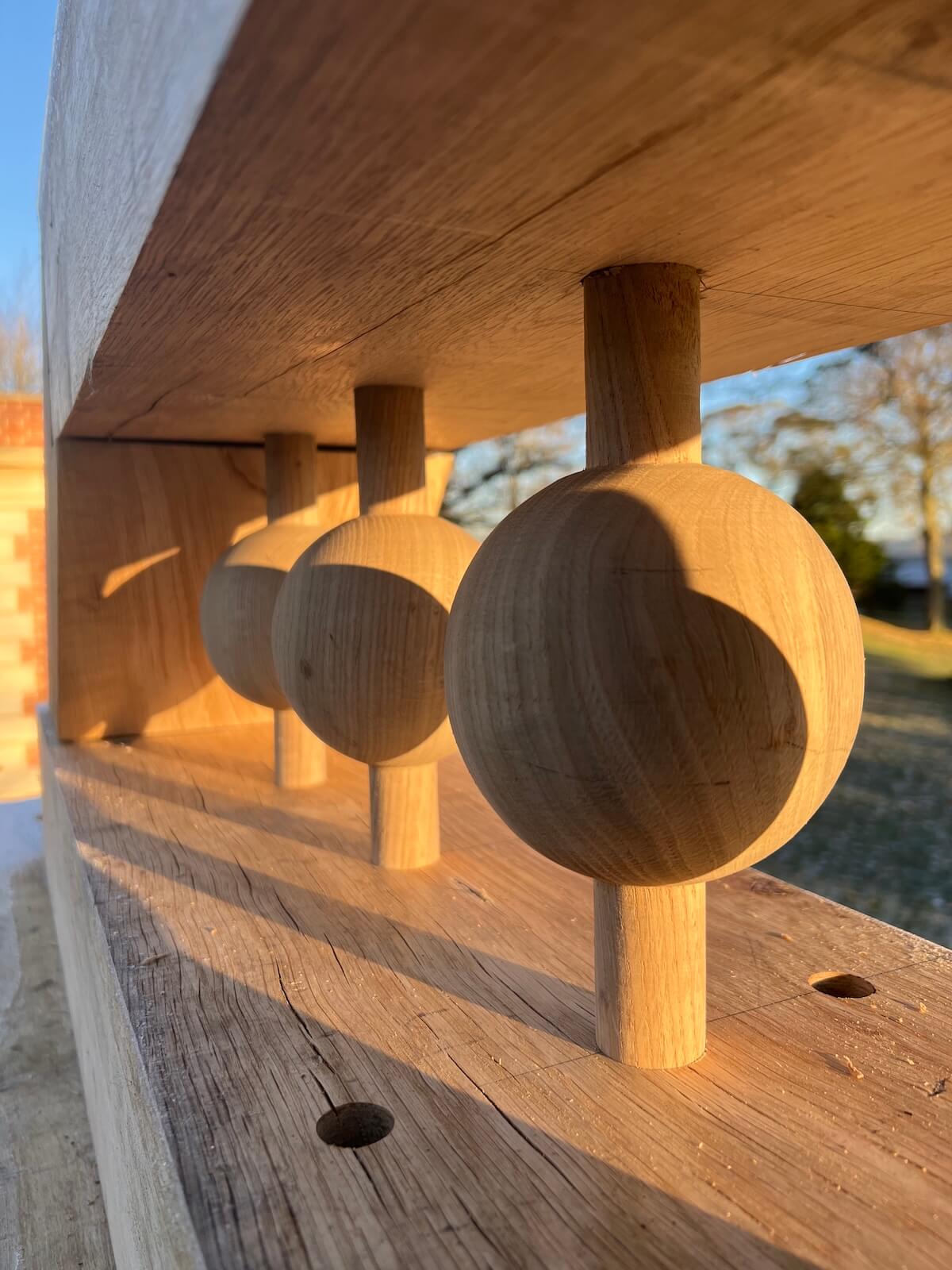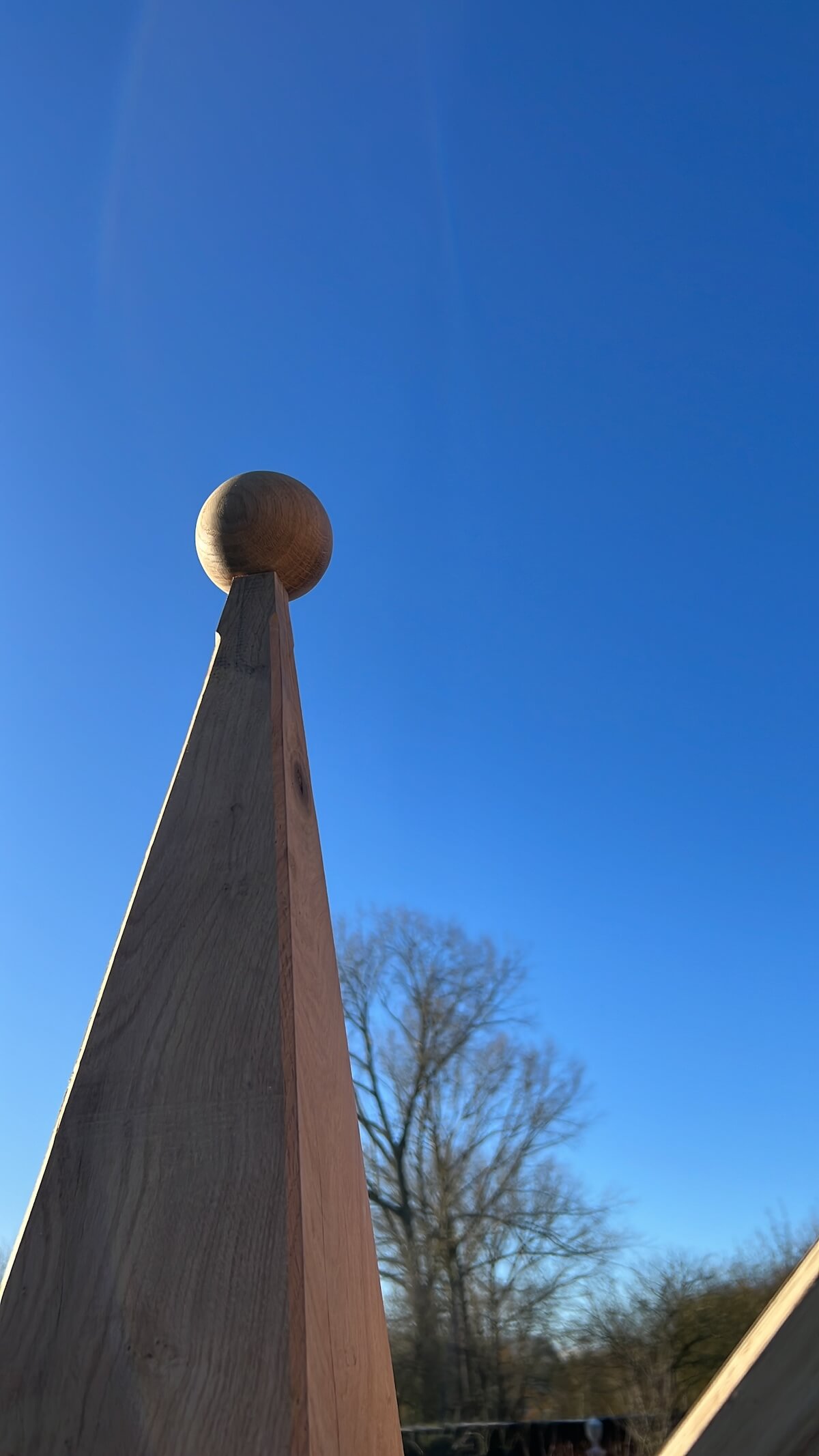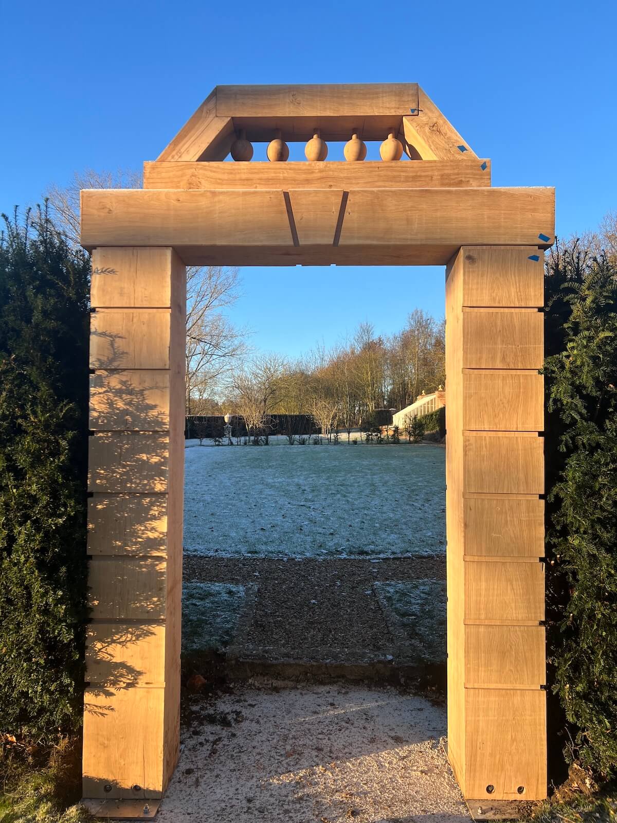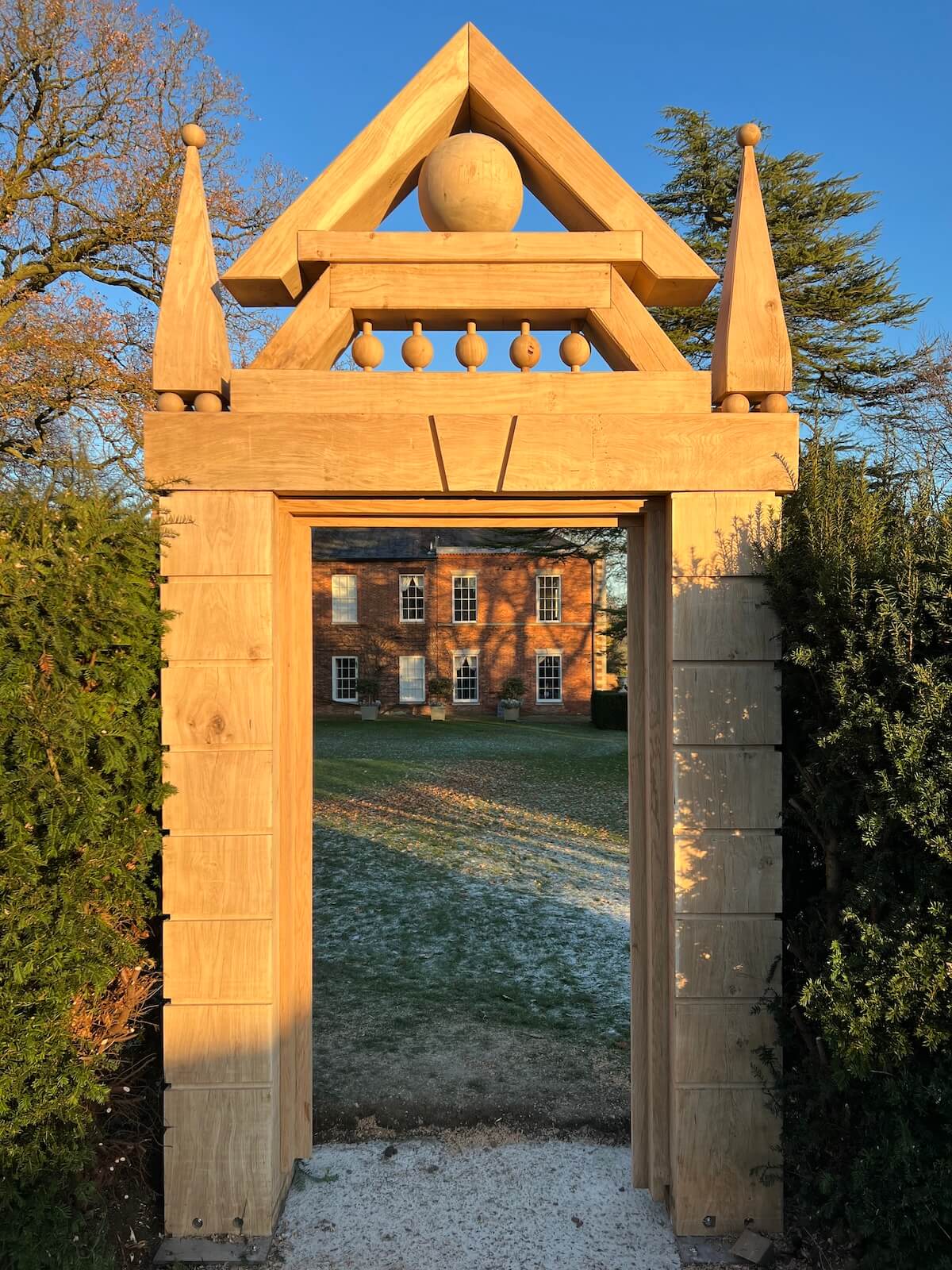 Crafted from green oak, this garden gate combines traditional joinery with a sense of playful architecture. Its bold triangular pediment, turned finials, and central sphere lend a sculptural presence, standing as both a threshold and a statement piece within the landscape.
