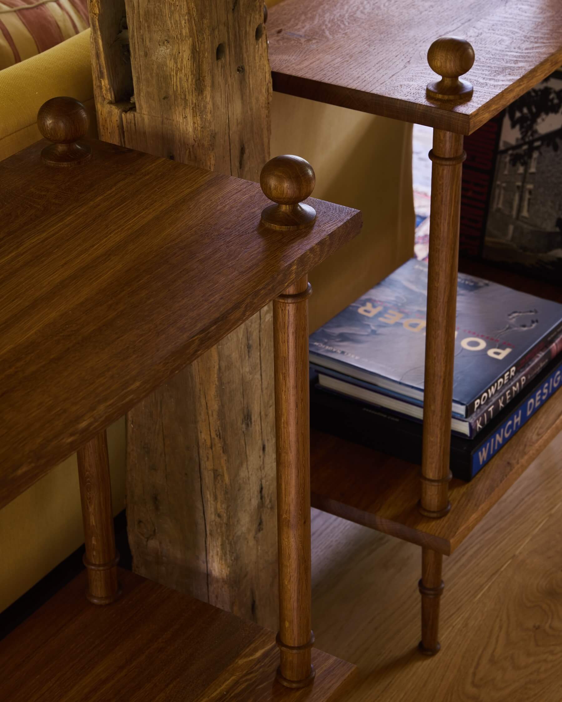 Thoughtfully designed for smaller spaces, this side table offers balance, proportion, and quiet detail. Handcrafted from fumed oak, it features two slender shelves supported by turned column legs finished with crisp finials. Refined and versatile, it’s a subtle yet characterful piece — made slowly and carefully in our workshop.