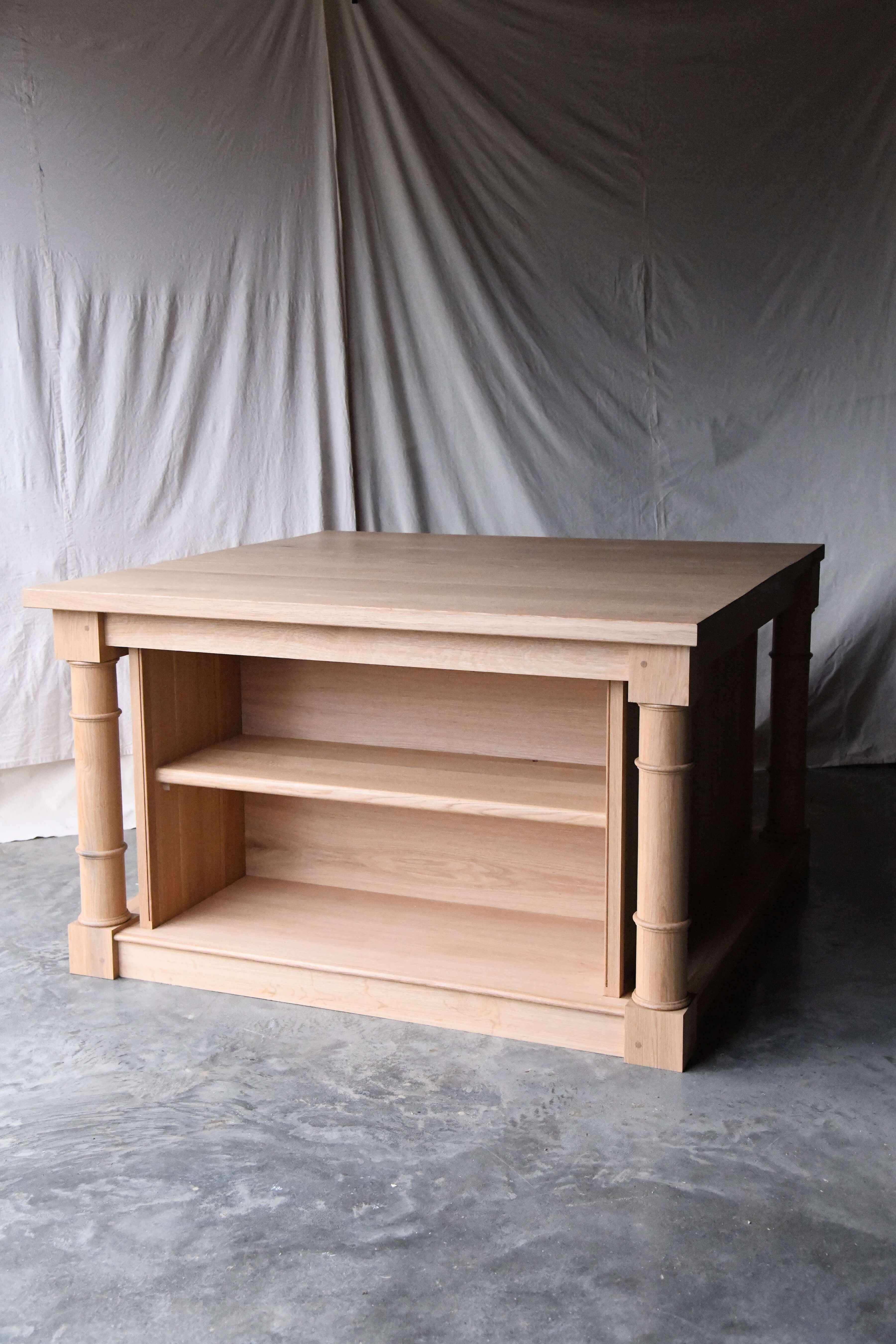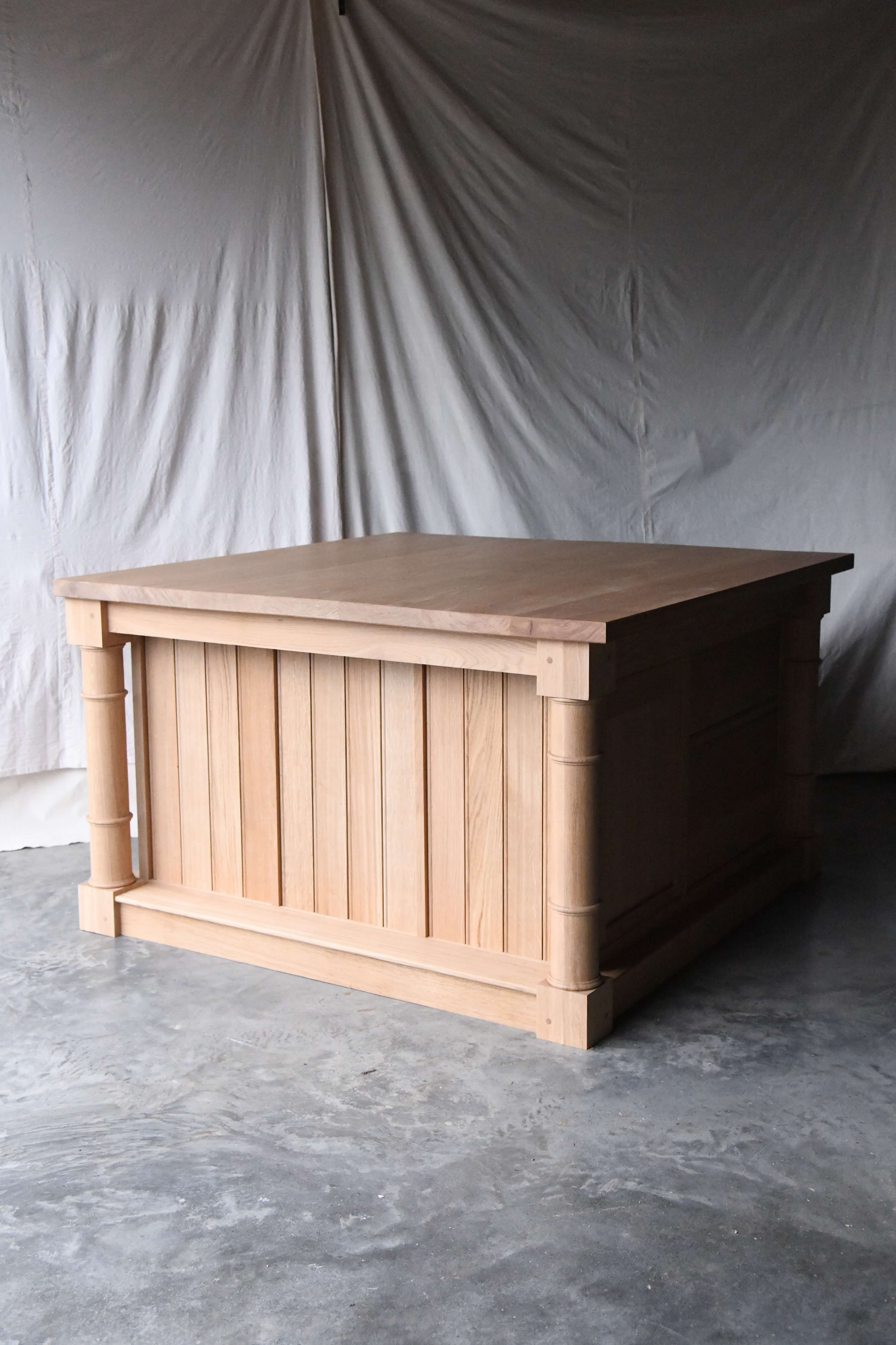 Handcrafted from solid British oak, the Rectory Island combines practical function with refined, architectural detail. Its solid framework and turned corner columns give a sense of quiet strength, while the panelled sides and fitted drawers provide generous storage and a grounded, balanced presence. Designed and made in our own workshop, it’s a piece that brings warmth, structure, and purpose to the heart of the home.