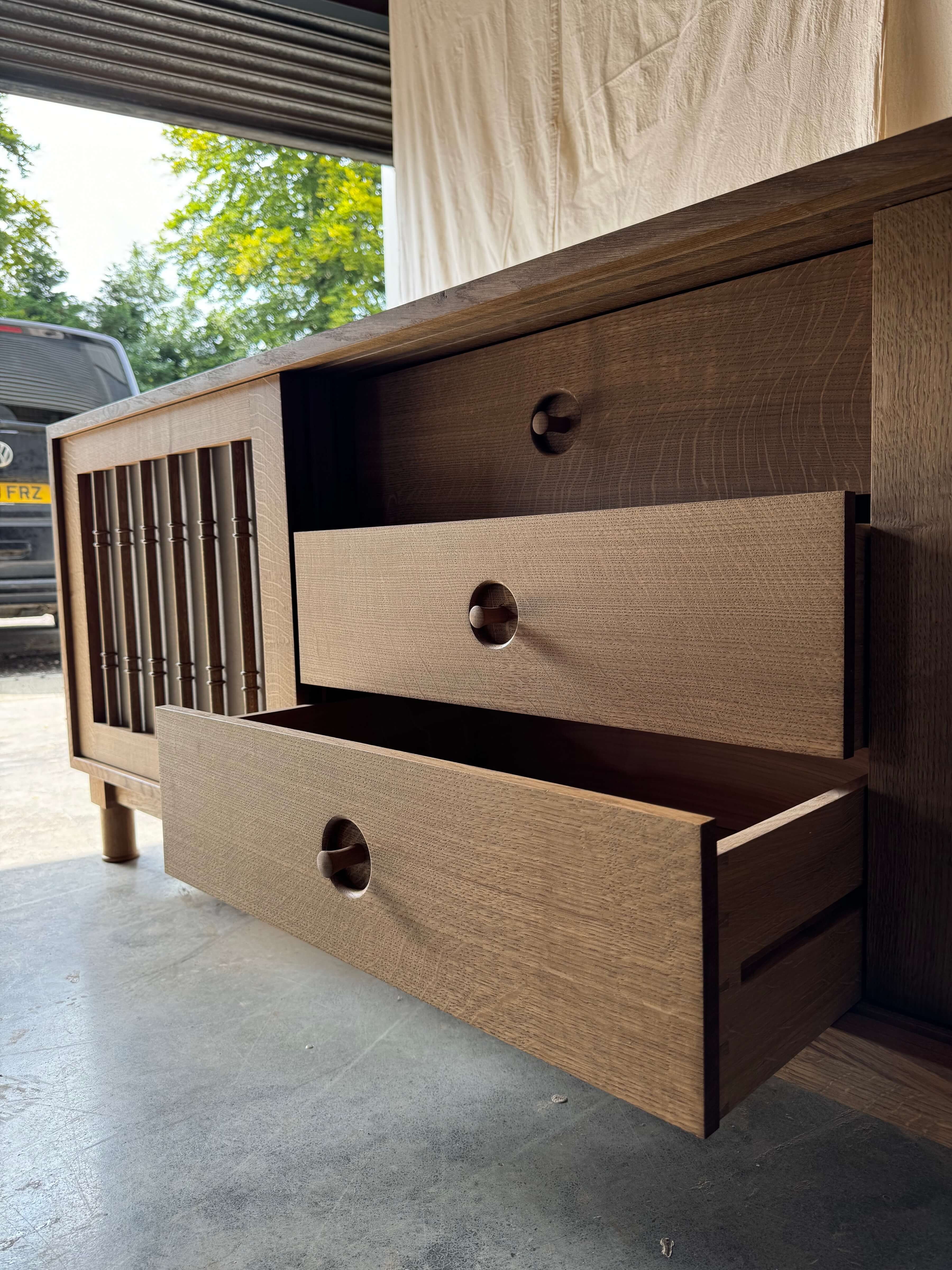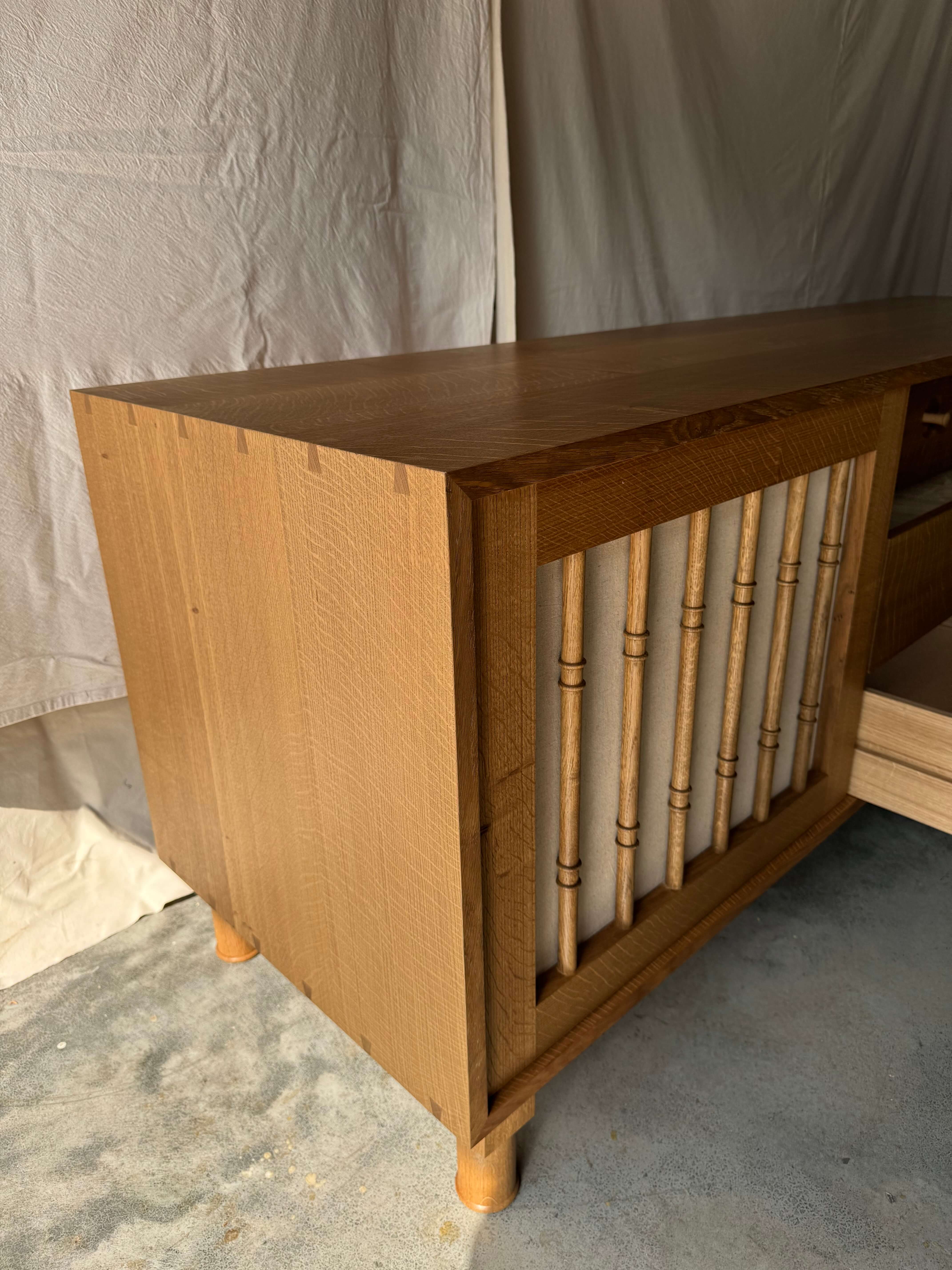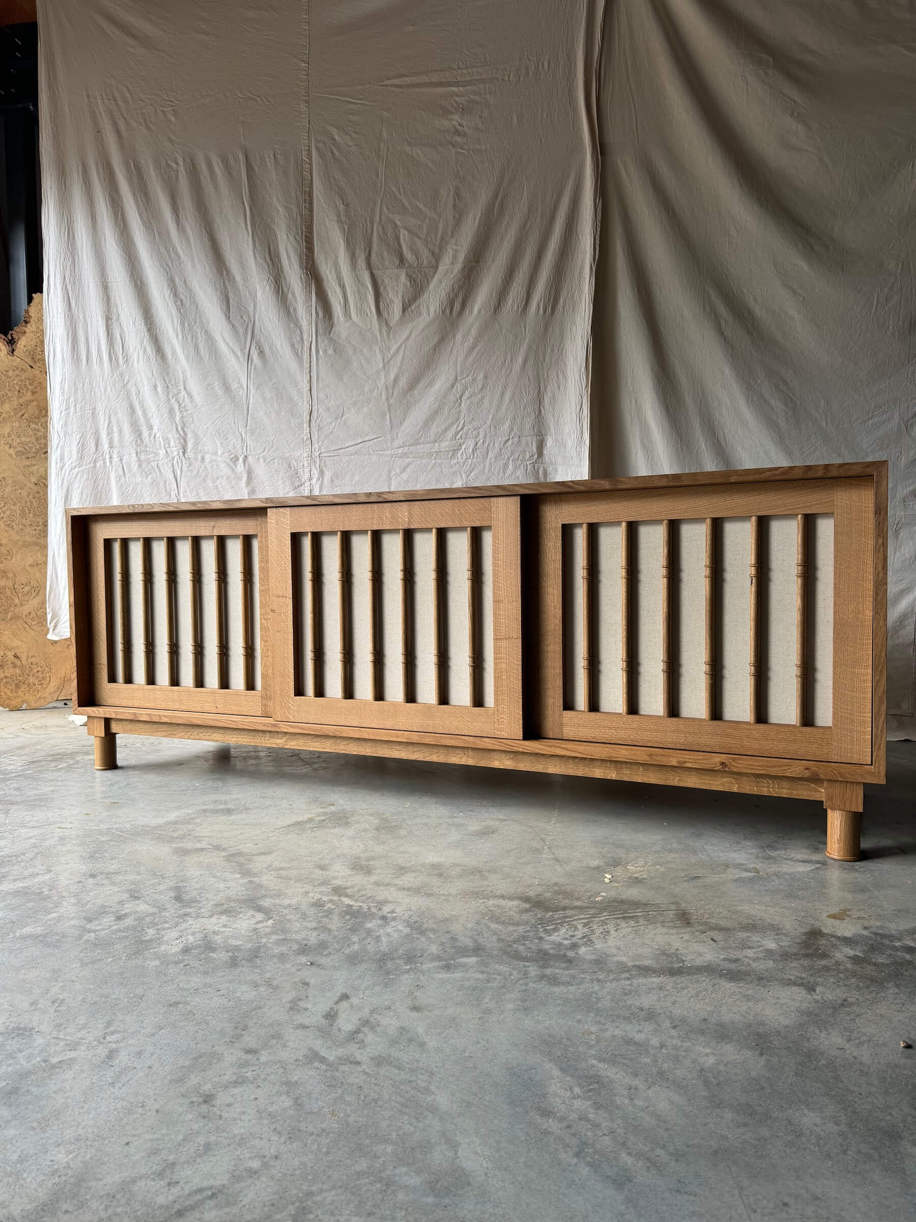 Crafted from fumed English oak, the Rectory Credenza embodies a quiet, architectural elegance inspired by Japanese design. The sliding panel doors feature finely spaced vertical slats, softened by natural fabric backings that create depth and warmth. Balanced proportions and thoughtful detailing allow the piece to feel both grounded and light. Made entirely in our workshop, it’s a study in restraint, craftsmanship, and timeless form.