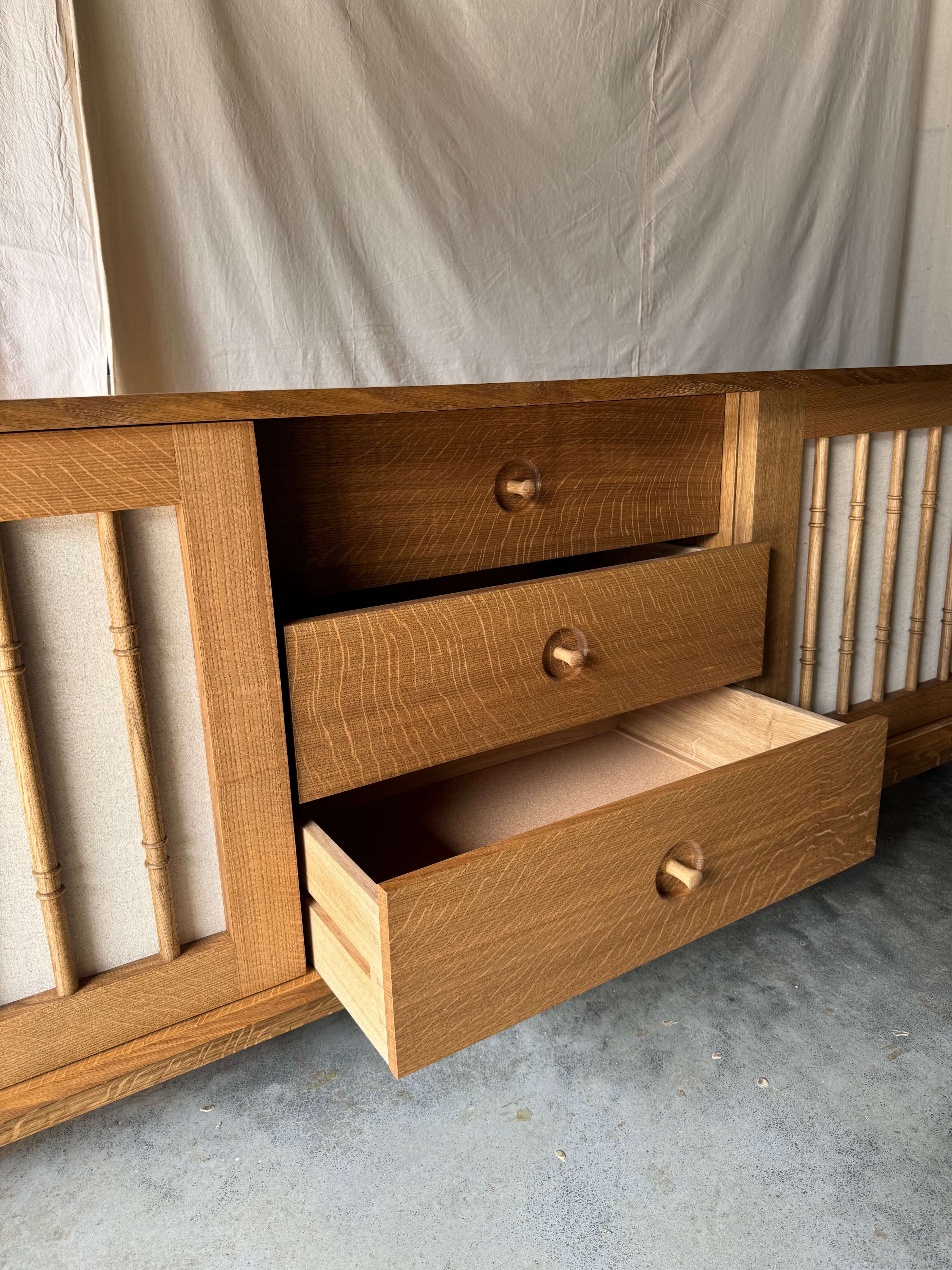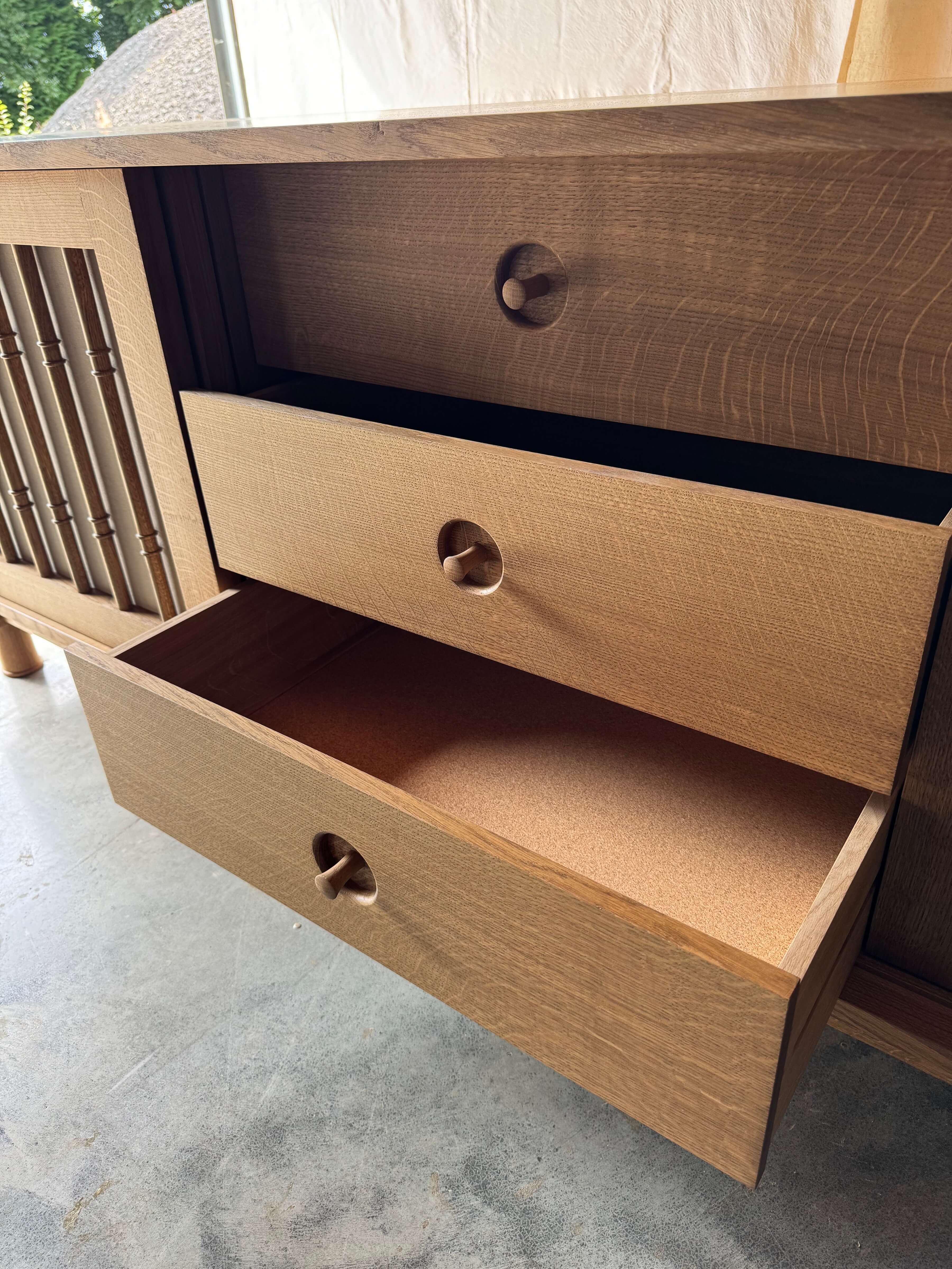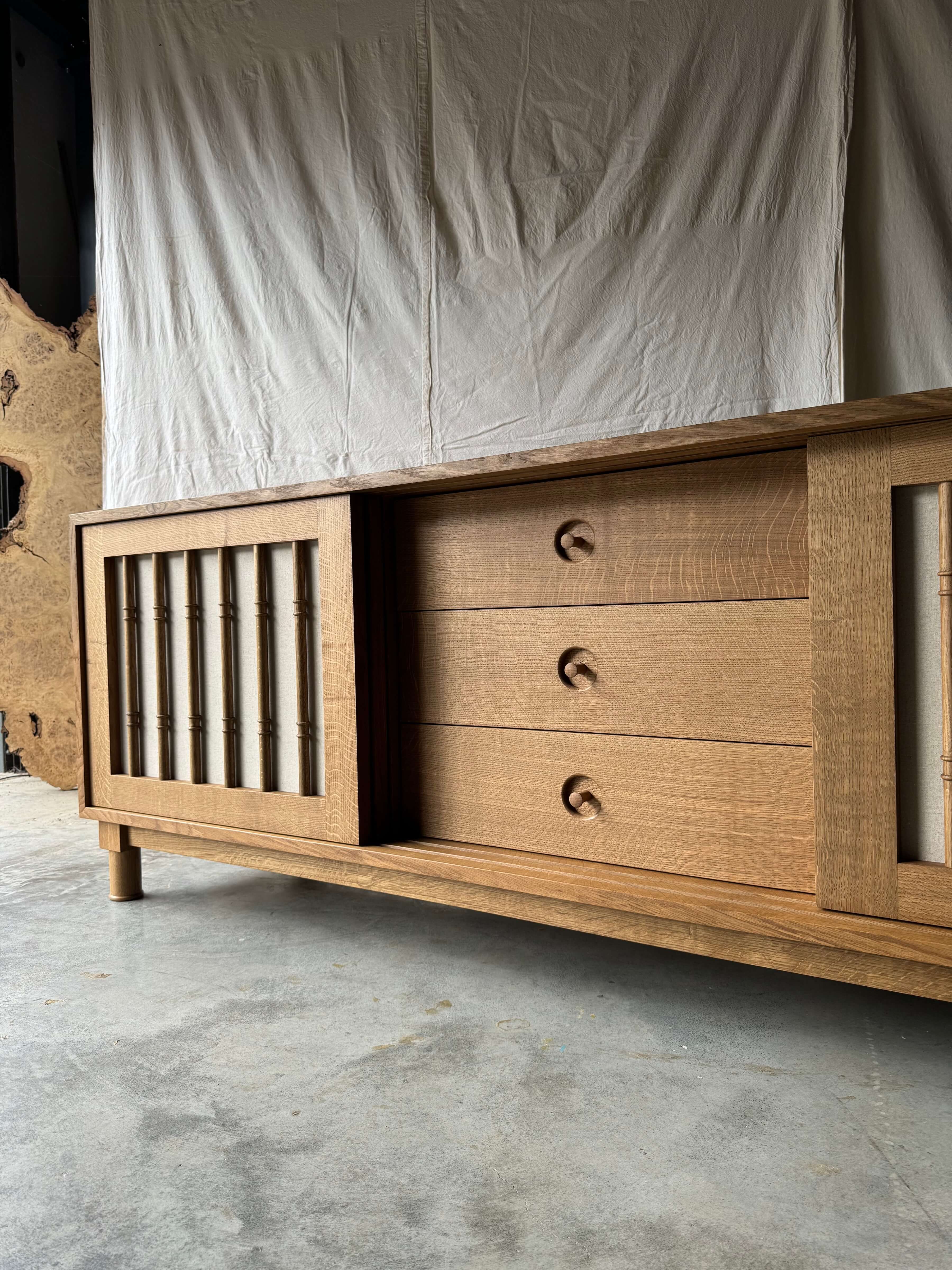 Crafted from fumed English oak, the Rectory Credenza embodies a quiet, architectural elegance inspired by Japanese design. The sliding panel doors feature finely spaced vertical slats, softened by natural fabric backings that create depth and warmth. Balanced proportions and thoughtful detailing allow the piece to feel both grounded and light. Made entirely in our workshop, it’s a study in restraint, craftsmanship, and timeless form.