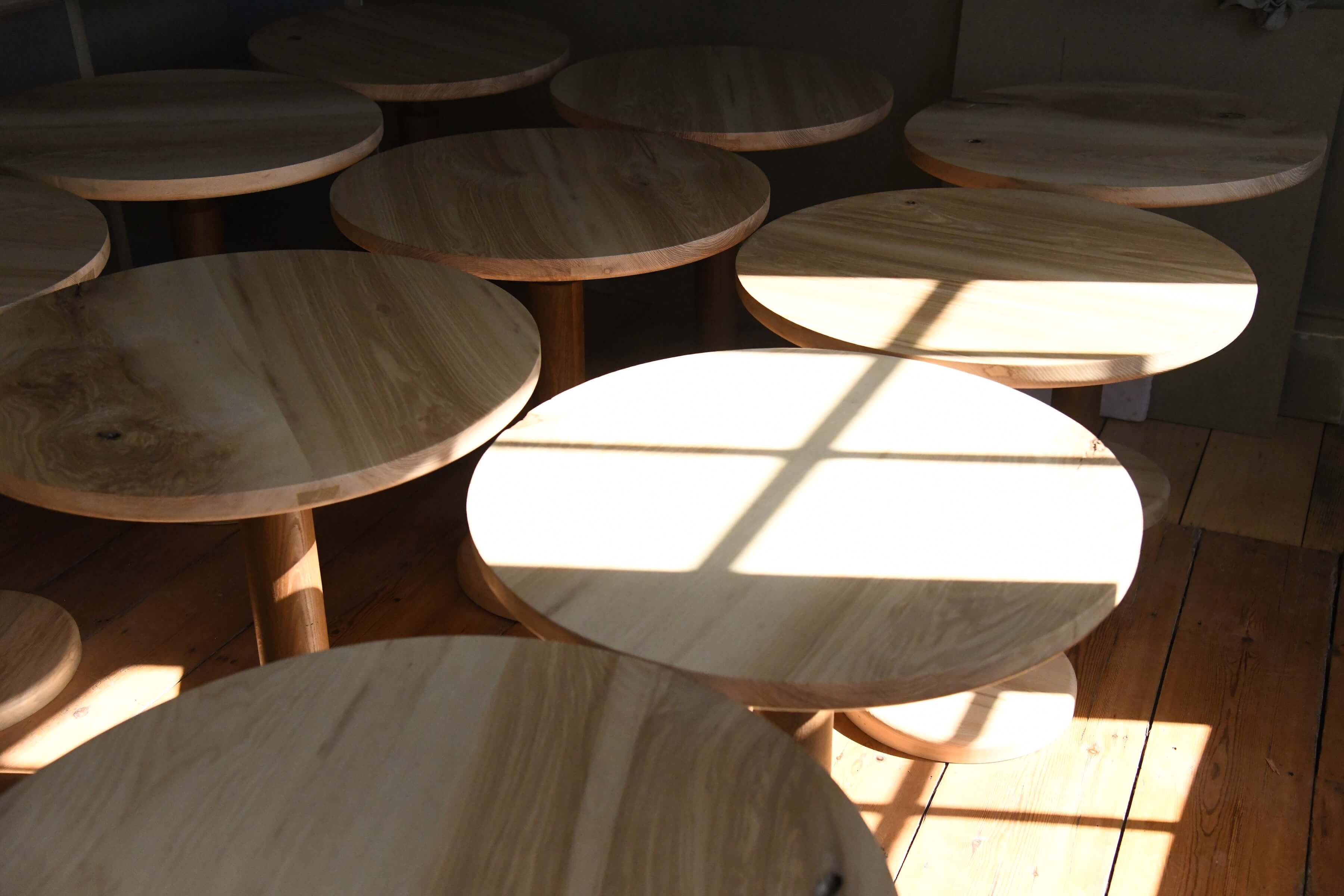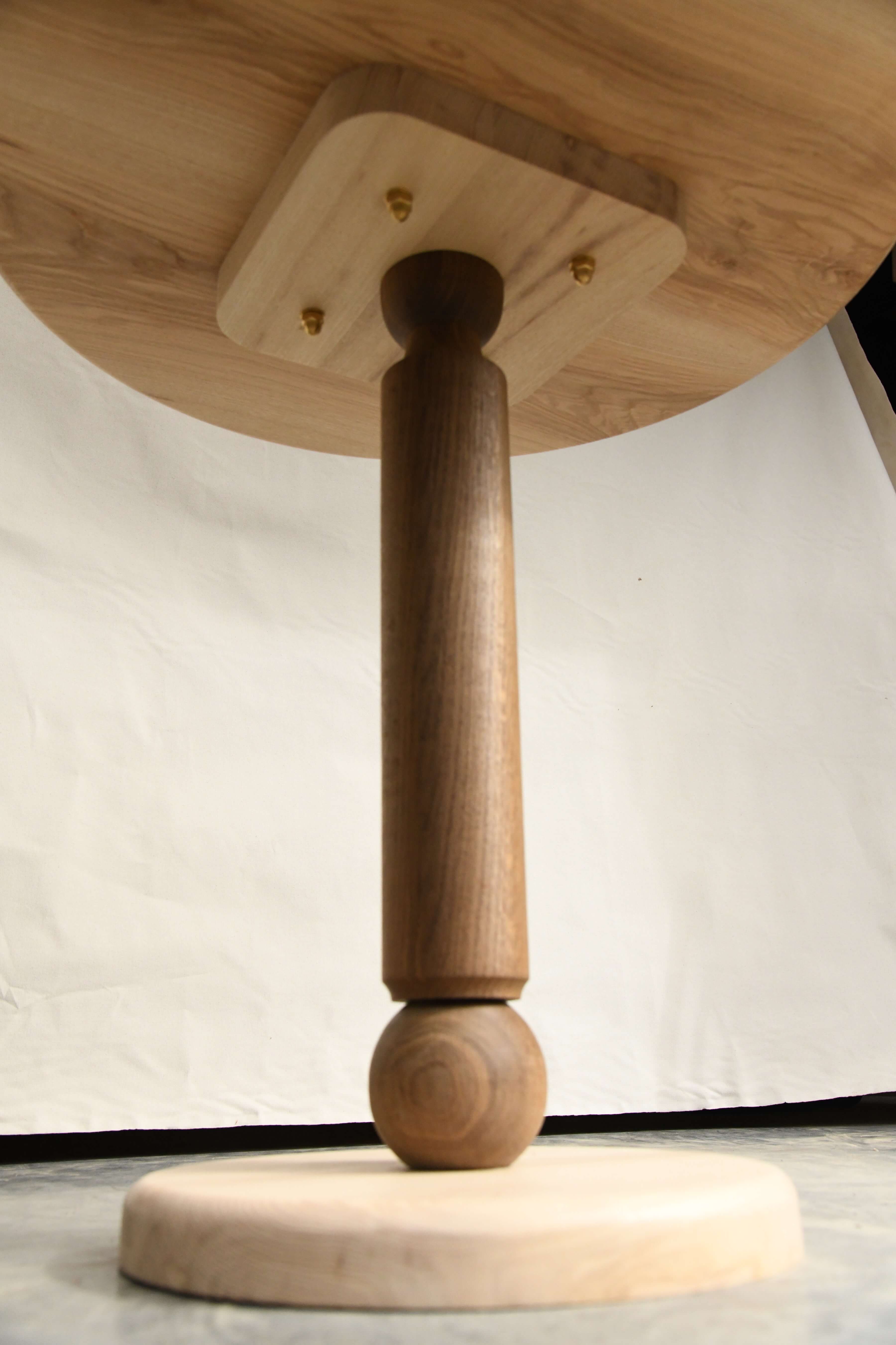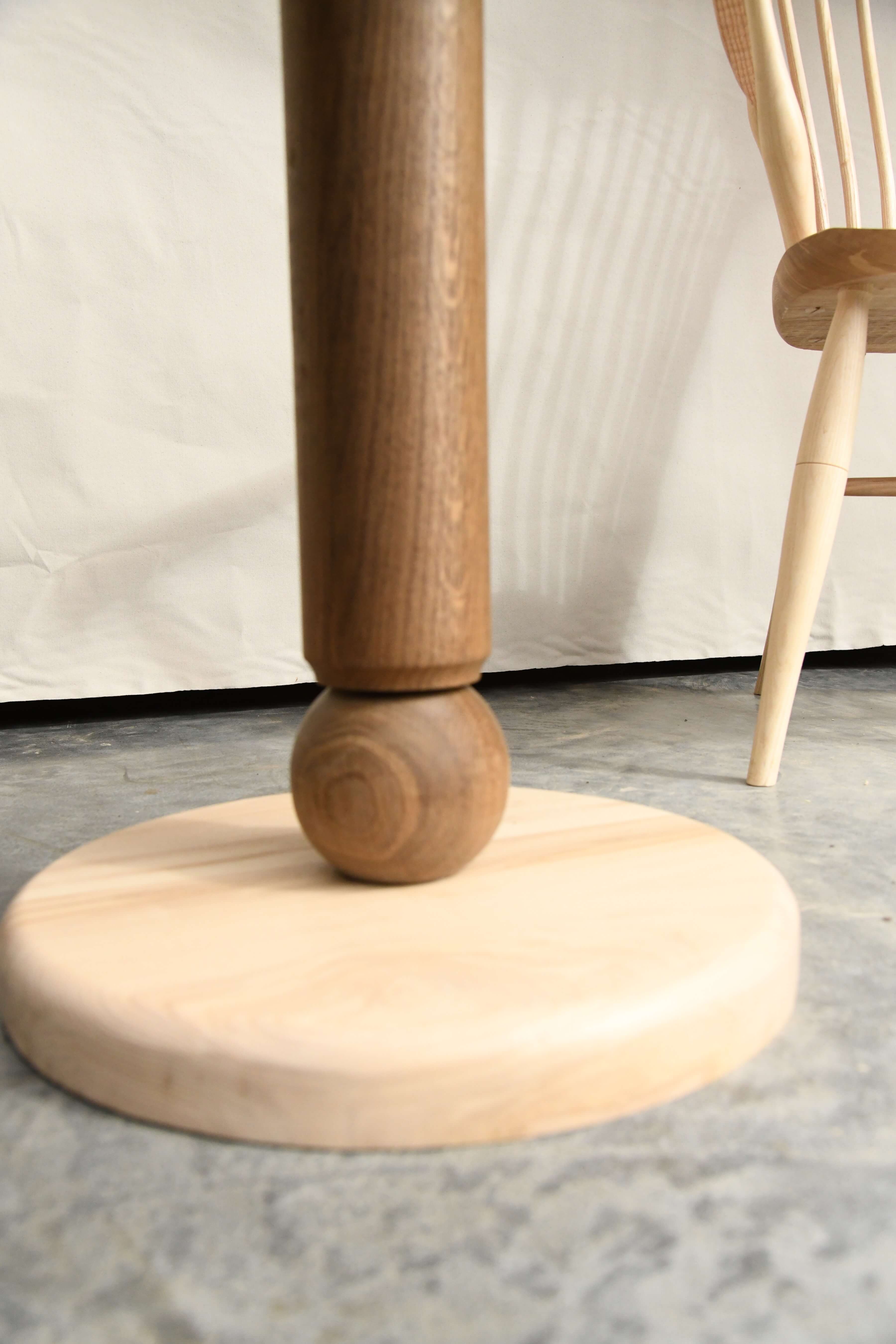 Handcrafted from fumed oak and English ash, this table balances contrast and harmony in equal measure. The sculpted pedestal base combines smooth, rounded forms with crisp detailing, creating a sense of quiet strength and poise. The pale ash top rests lightly above the darker oak column, highlighting the natural character of each timber. Elegant in proportion and modern in spirit, it’s a small table with a distinctly architectural presence.
